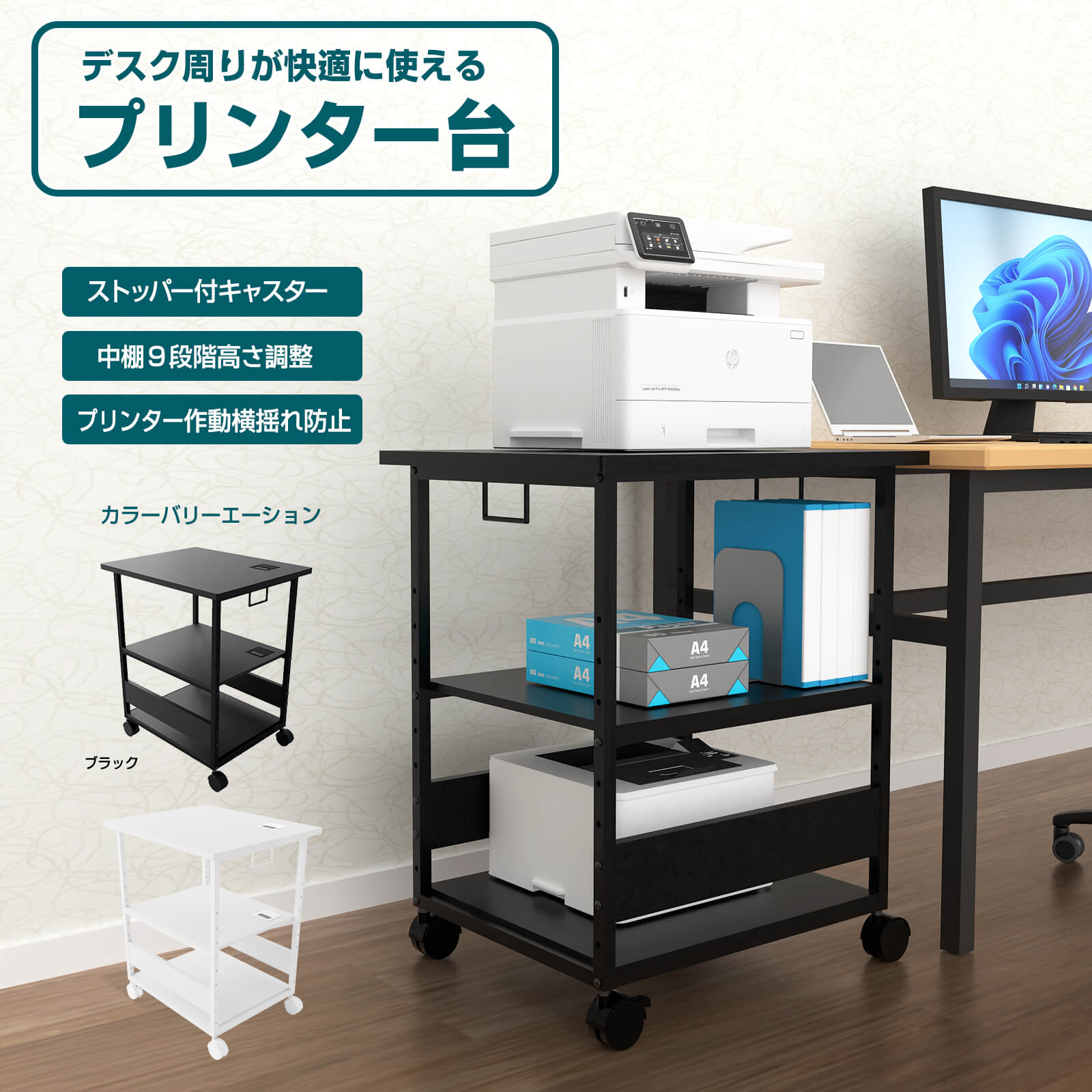 プリンター台 デスクサイドワゴン キャスター付き プリンターラック 中棚高さ9段階調節 両側取っ手付き パソコンワゴン オーディオラック デスクサイド収納 棚