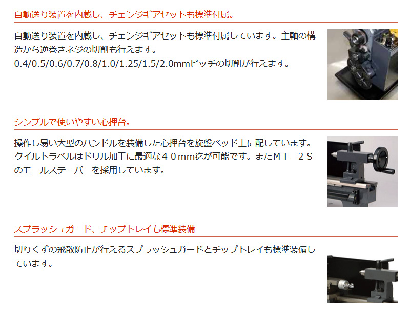 ・三爪スクロールチャック、スプラッシュガード、チップトレイを標準装備。