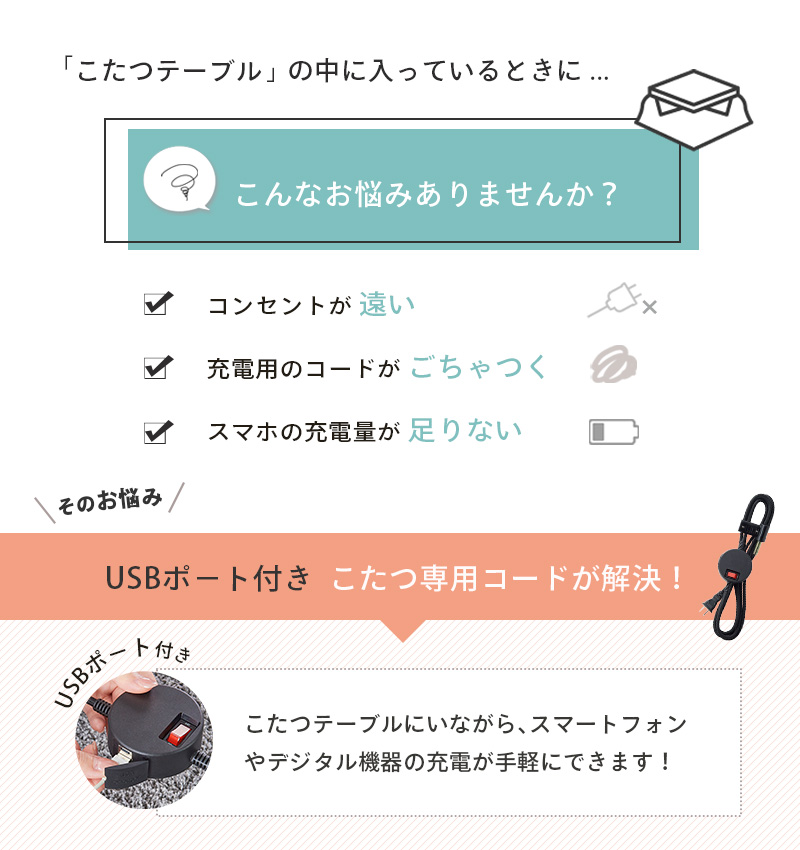 ※USBポートは、電源プラグがご家庭のコンセントに接続されている間は常時通電しています。こたつスイッチで充電のON/OFFを切り替えることはできません。