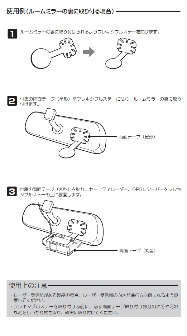 ・レーダー探知機などのアンテナをルームミラーの裏などに取り付けできます。
