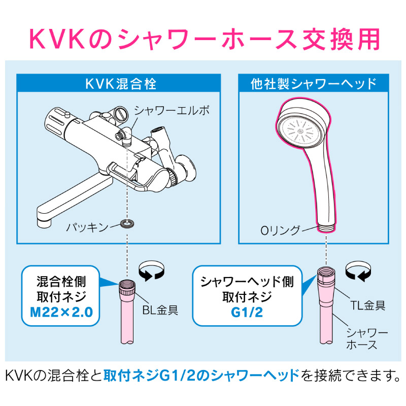 KVKの混合栓用シャワーホース1.6mのシルバーです。話題のマイクロバブルシャワーヘッドや節水シャワーヘッドなどをアダプターなしで取付けできます。工具不要で取付簡単です。