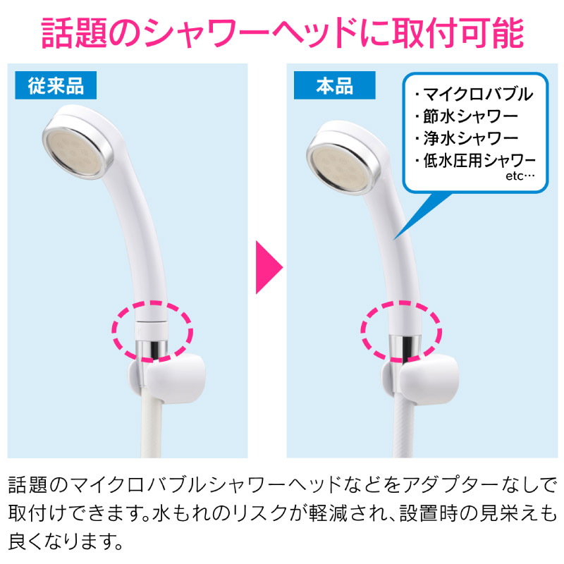 ◆シャワーヘッド側のネジがG1/2になっているので、話題のマイクロバブルシャワーヘッドや節水シャワーヘッドなどをアダプターなしで取付けできます。