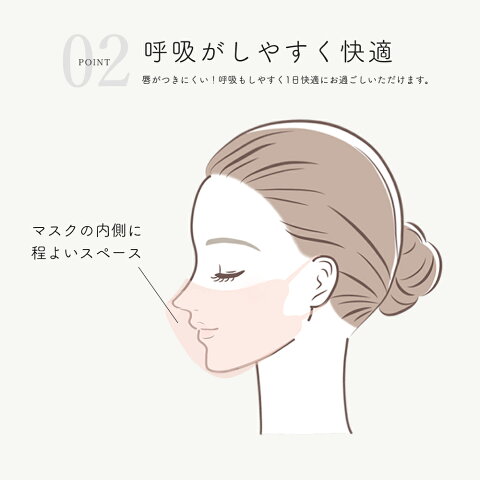 マスクの中に程よい空間ができるので、呼吸しやすく、長時間つけていても快適に過ごすことができます。<br>