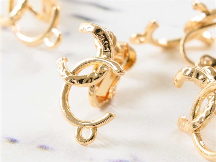 三日月のようなCの形のパーツが二つ連なったデザインのモチーフがついたネジバネ式のイヤリングパーツです。