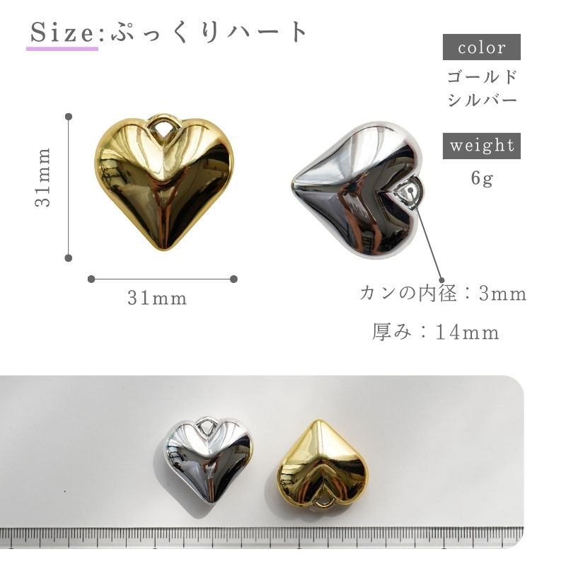 ぷっくりハート:約31mm×31mm 厚み:約14mm カンの内径:約3mm