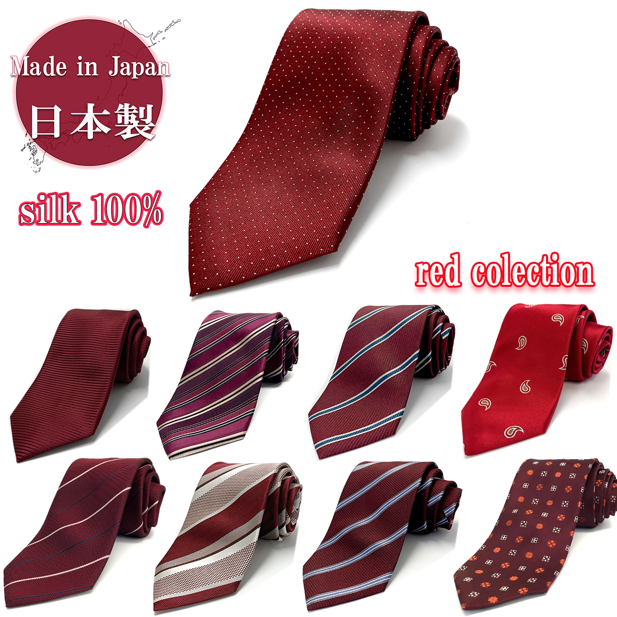 ネクタイ 日本製 シルク 100% 赤 レッド ワイン 無地 ストライプ ドット ビジネス 就活 面接 結婚式 父の日 プレゼント 絹 おしゃれ メール便送料無料