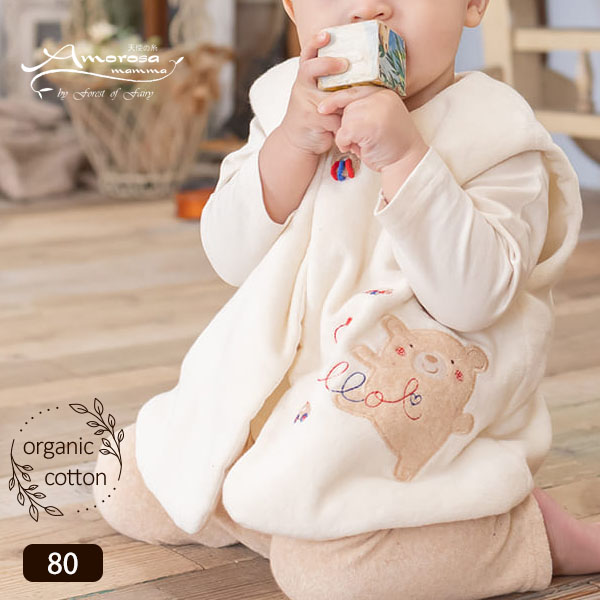ふわふわあたたかベスト Amorosa mamma(アモローサマンマ) 天使の糸のオーガニックコットン ベビー【くまのコットン】ベストです。 薄い綿入りで、ふんわりとしたベストです。 まだ体温調節機能が未熟な赤ちゃんにとってベストは必須アイテム。 キュートなくまの刺しゅうが、可愛い赤ちゃんをさらに引き立ててくれます。 首元には遊び心のある手編みのガラガラがついています。 ベストは袖がないので赤ちゃんの腕の動きを妨げず、着脱がしやすくとっても便利。 お部屋の中での防寒対策や、春先、秋口など気温の変化がある時期にも役に立ちます◎ - Fabric - 表はシンカーパイルでふわふわ。 裏はシングルガーゼの裏地は通気性もよく吸汗性もバツグン◎ どちらもオーガニックコットン100%の赤ちゃんにやさしい素材。 ほのぼのくまのコットン くまのファミリー。 名前は「コットン」と「リネン」。 ぷくっとしたかわらしいフォルムは抱きしめたくなる可愛さ♪ 同じシリーズの他のグッズと揃えて、出産のお祝いにもおすすめです。 »くまのコットンシリーズはこちら |