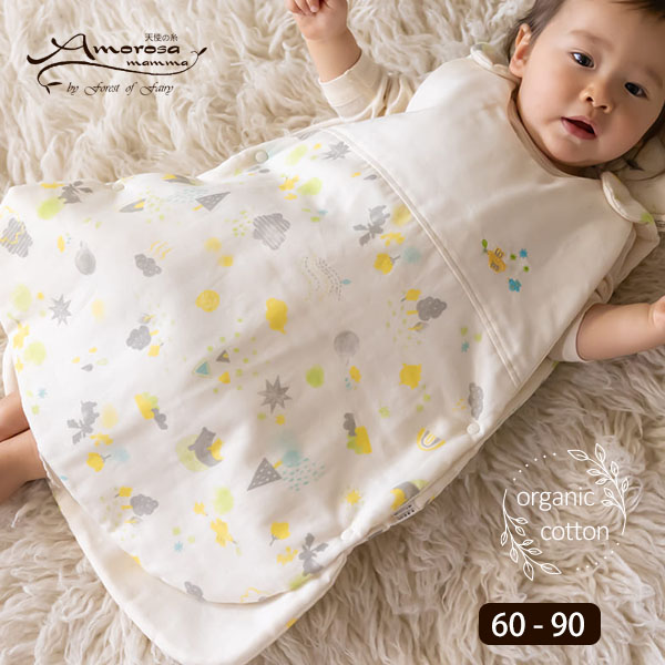 水彩画のやさしさが溶け込むベビーグッズ Amorosa mamma(アモローサマンマ) 天使の糸のオーガニックコットン ベビー【ミントの森】ダブルガーゼ スリーパーです。 優しい色合いで描いたイラストが、赤ちゃんをメルヘンな世界の主人公にしてくれるスリーパー。 柔らかさの中に黄色などのあざやかなカラーがアクセントに◎ 中綿が入っているので、赤ちゃんをやさしく包み込んで冬の冷気や夏のエアコンによる寝冷えから守ってくれる心強いアイテムです。 足が出せるタイプは、お風呂上がりの冷え防止など起きている時から使えて便利です。 スリーパーは1枚あると温度調整がしやすいので、オールシーズンとても重宝します。 胸元にはかわいい刺しゅう♪ 両脇と肩のスナップボタンで、前後の身頃が分かれるので寝ている赤ちゃんへの着脱もらくらく。 長く着られるスリーパーは、ギフトとしても人気があります◎ - Fabric - オーガニックコットン100%のダブルガーゼは通気性もよく吸汗性もバツグン。 寝ている間にもたくさん汗をかく赤ちゃんにぴったり! ミントの森の動物たち たくさんの動物たちに囲まれて、まるでおとぎ話の世界の主人公になったよう。 水彩画のやさしさが溶け込む布、 風や光を透す、やわらかなオーガニックコットンのガーゼ素材で あかちゃんのためのアイテムをつくりました。 同じシリーズの他のグッズと揃えて、出産のお祝いにもおすすめです。 »ミントの森シリーズはこちら |