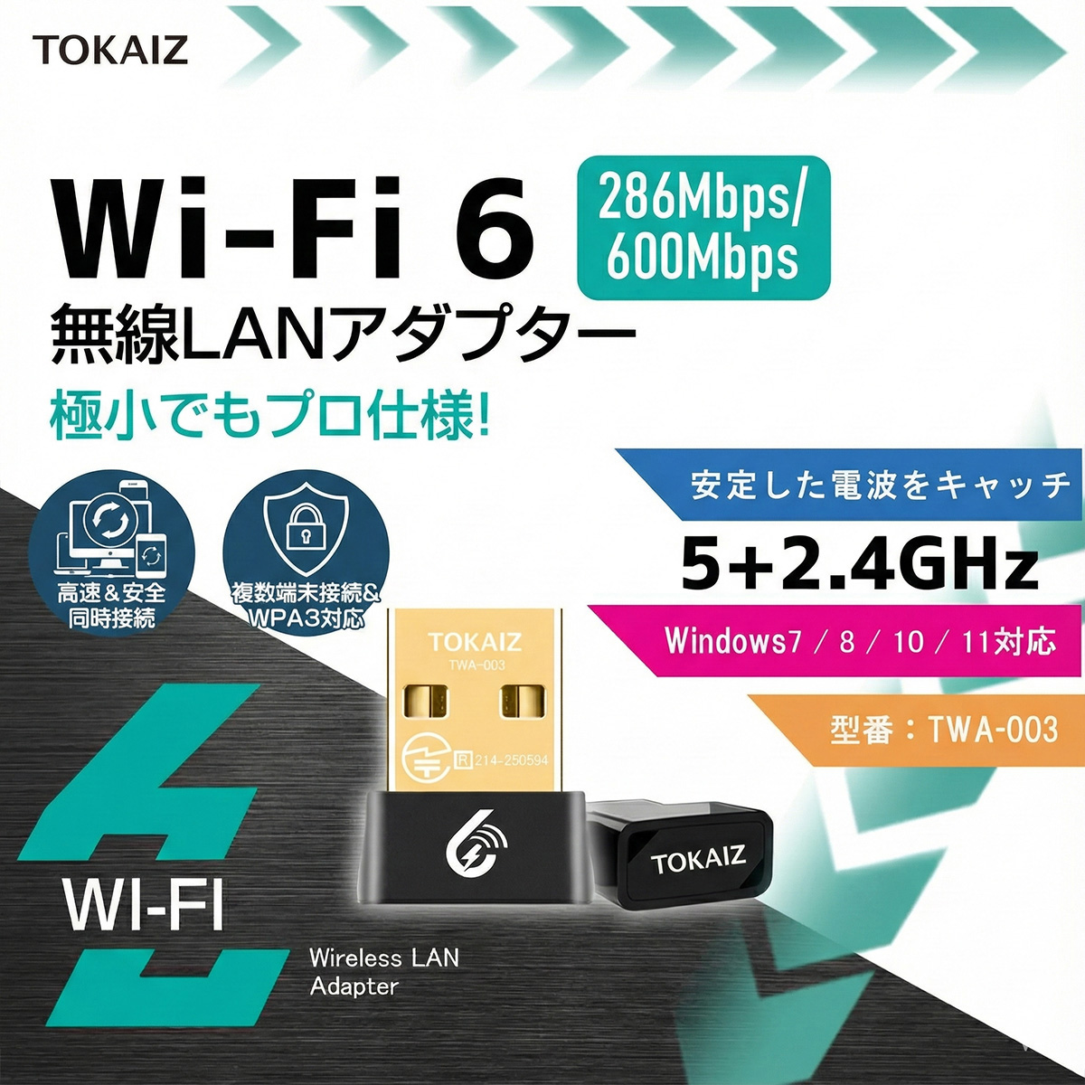 | 商品仕様 | 準拠規格:IEEE802.11b/g/n/a/ax 周波数:2.4GHz/5GHz 転送速度(規格値):2.4GHz 最大286Mbps、5GHz 最大600Mbps セキュリティー:WPA-PSK/WPA2-PSK/WPA3 インターフェース:USB2.0 本体サイズ:19×15×6mm 対応OS:Windows 10 / 11 重量:約2g ※仕様データは設計数値であり、誤差が生じる場合があります。 |