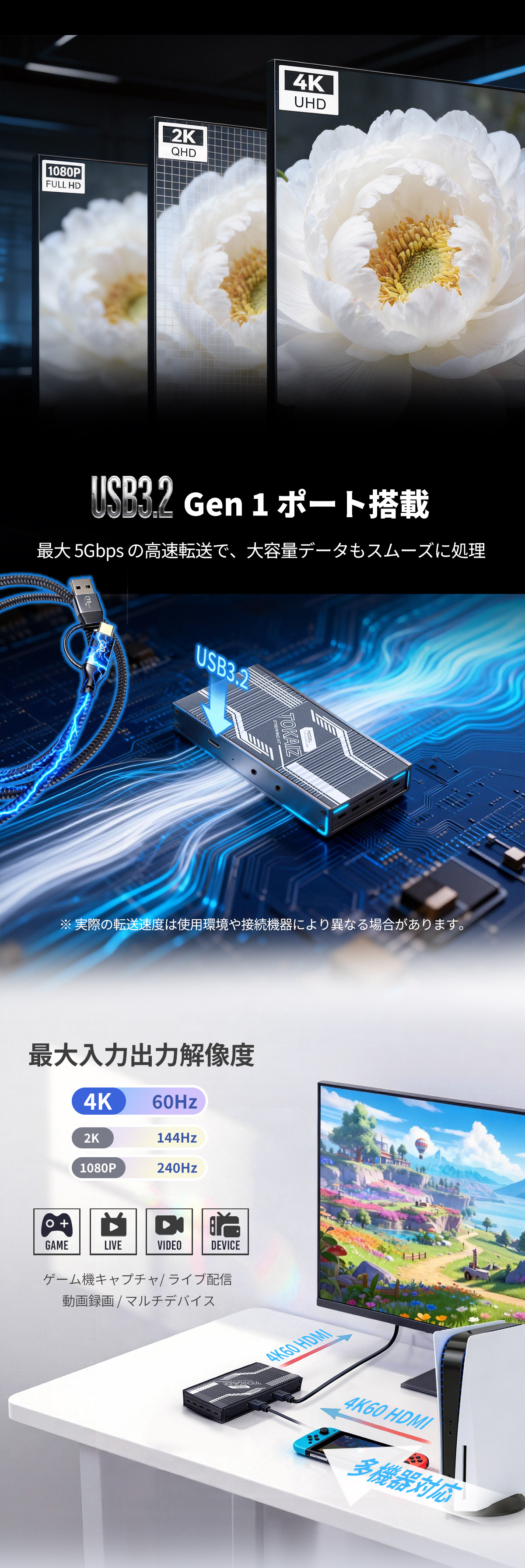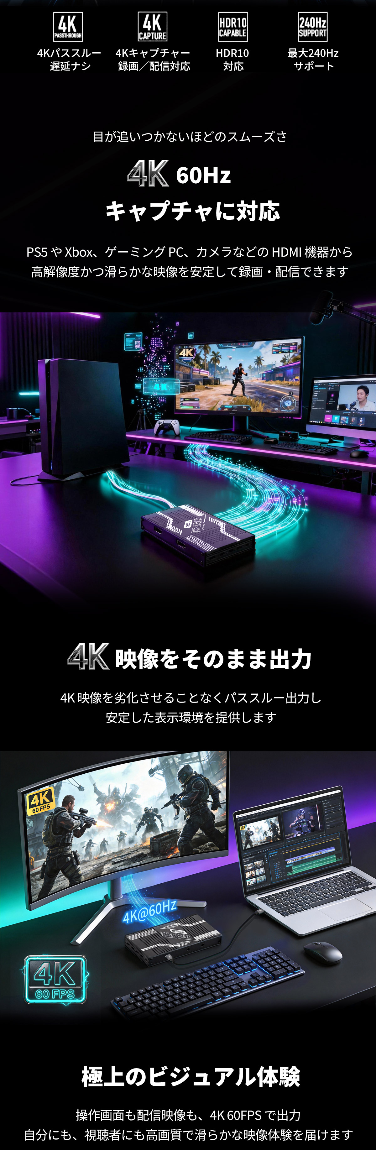 ・【4K60Hz高精細キャプチャー】最大4K60Hzの超高精細映像で録画・配信が可能!滑らかな動きと鮮明なディテールをリアルに再現し、視聴者に圧倒的な没入感を提供します。