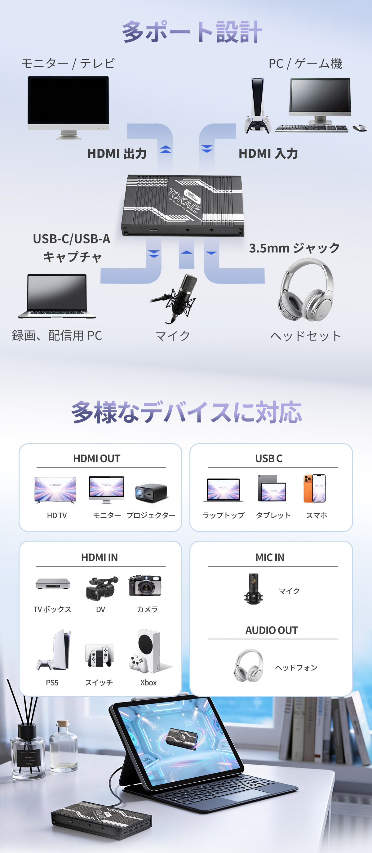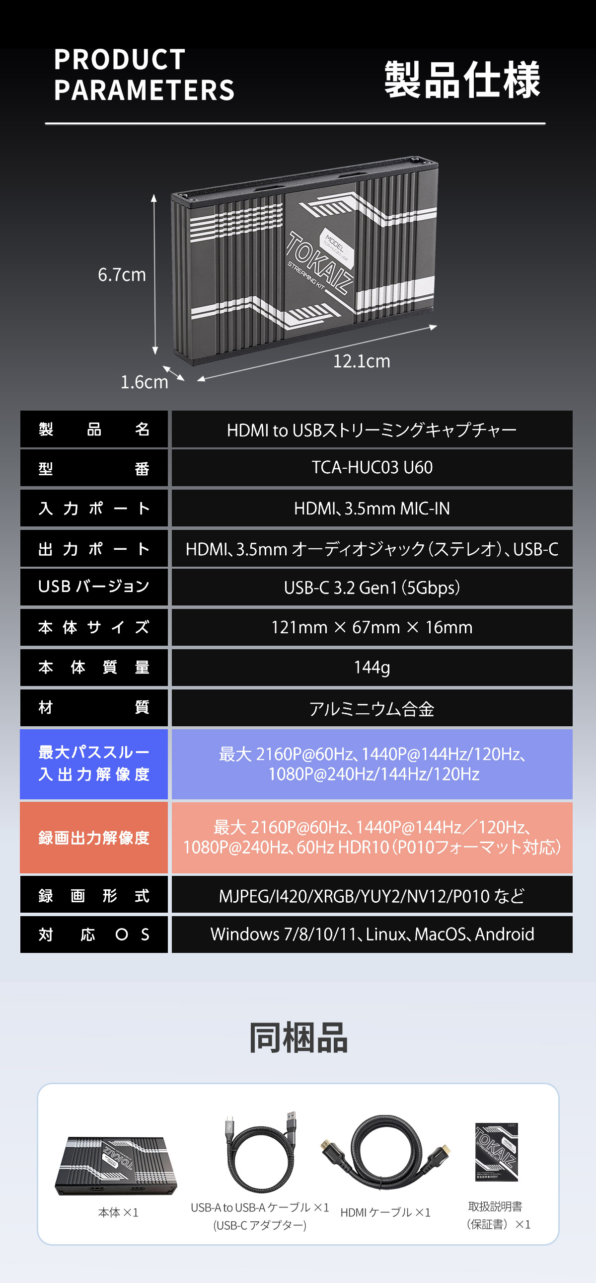 | 商品仕様 | 製品名:HDMI to USBストリーミングキャプチャー 型番:TCA-HUC03 U60 入力ポート:HDMI、3.5mm MIC-IN 出力ポート:HDMI、3.5mm オーディオジャック(ステレオ)、USB-C USBバージョン:USB-C 3.2 Gen1(5Gbps) 本体サイズ:121mm × 67mm × 16mm 本体質量:144g 材質:アルミニウム合金 最大パススルー入出力解像度:最大 2160P@60Hz、1440P@144Hz/120Hz、1080P@240Hz/144Hz/120Hz 録画出力解像度:最大 2160P@60Hz、1440P@144Hz/120Hz、1080P@240Hz、60Hz HDR10(P010フォーマット対応) 録画形式:MJPEG/I420/XRGB/YUY2/NV12/P010 など 対応OS:Windows 7/8/10/11、Linux、MacOS、Android |