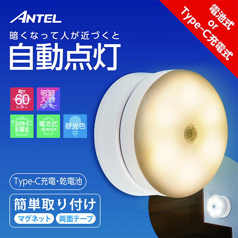 【ANTEL 充電式角度調整ナイトライト(電球色)】 送料無料 ナイトライト 明暗人感センサー 自動点灯 電球色 角度調整可能 60ルーメン 8cm