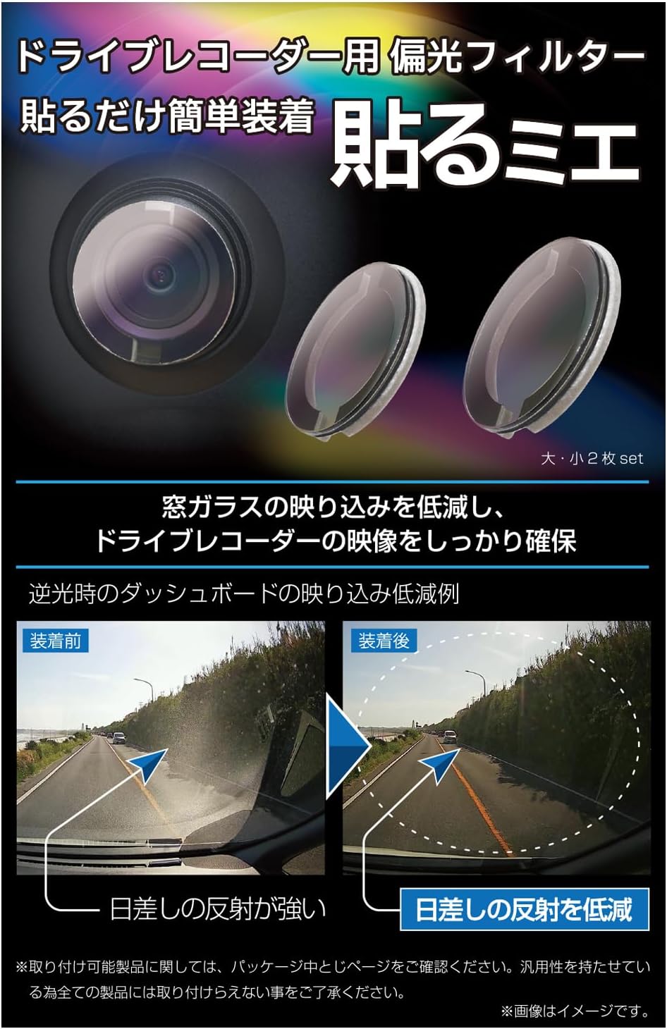 本製品はドライブレコーダー室内カメラのレンズ部へ貼り付けるだけで、映り込みを低減しクリアな映像で録画できる偏光フィルターとなります。