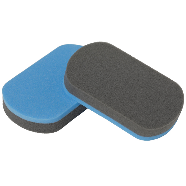 二層構造スポンジ:柔面(グレー)で泡を広げ、硬面(グリーン)で余分な泡をふき取ります。