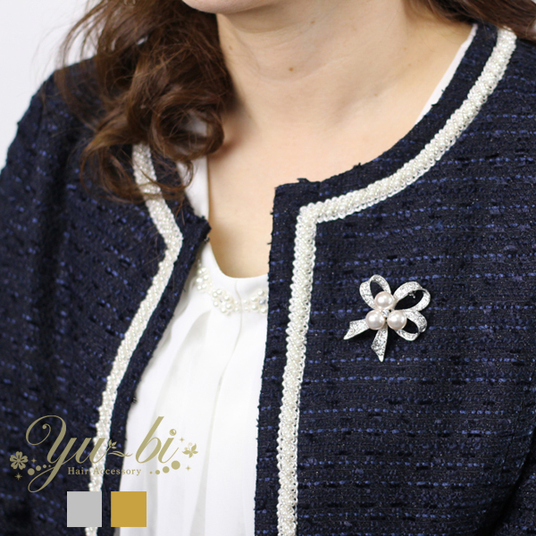 【ゆうパケット送料無料】ブローチ/くるりんリボン パール&ラインストーン br16☆ゴールド/シルバー 結婚式 卒園式 セレモニー 卒業式 入学式