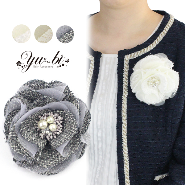 【定形外郵便OK290円】 コサージュ/ツイード オーガンジー重なり 大きめ c80☆白/ベージュ/グレー フォーマル 卒業式 入学式