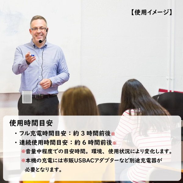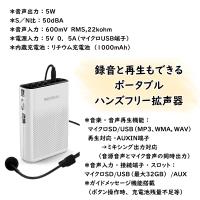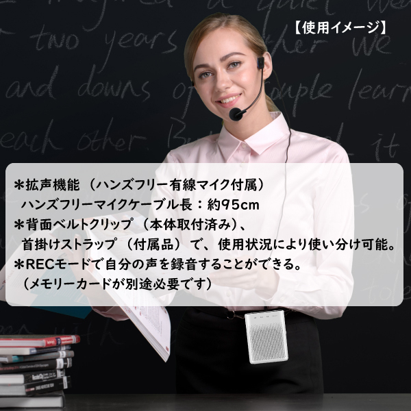 | 仕様 | *音声出力:5W *S/N比:50dBA *音声入力:600mV RMS,22kohm *電源入力:5V 0.5A(マイクロUSB端子) *内蔵充電池:リチウム充電池(1000mAh) *付属品:ハンズフリー有線マイク、首掛けストラップ、マイクロUSBケーブル、 AUXケーブル、取扱説明書(保証書) *拡声機能(ハンズフリー有線マイク付属) ハンズフリーマイクケーブル長:約95cm *音楽・音声再生機能: マイクロSD/USB(MP3、WMA,WAV)再生対応・AUXIN端子 →ミキシング出力(音源音声とマイク音声の同時出力)対応 *音声入力・接続端子・スロット:マイクロSD/USB(最大32GB)/AUX *ガイドメッセージ機能搭載(ボタン操作時、充電池残量不足等) *背面ベルトクリップ(本体取付済み)、首掛けストラップ(付属品)で 使用状況により使い分け可能。 *RECモードで自分の声を録音することができる (メモリーカードが別途必要です) *使用時間目安 ・フル充電時間目安:約3時間前後※ ・連続使用時間目安:約6時間前後※ ※音量中程度での目安時間。環境、使用状況により変化します。 ※本機の充電には市販USBACアダプターなど別途充電器が必要となります。 |
