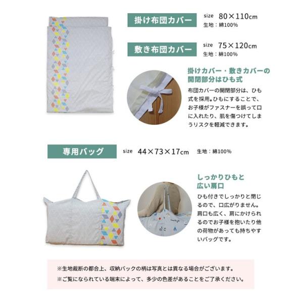 | 素材 | ・お昼寝掛け布団 側生地:ポリエステル100%、 中わた:ポリエステル100% ・お昼寝敷き布団 側生地:ポリエステル100%、 中わた:ポリエステル100% ・掛け布団カバー 生地:綿100% ヒモ止め式 ・敷き布団カバー 生地:綿100% ヒモ止め式 ・専用バッグ 生地:綿100% |