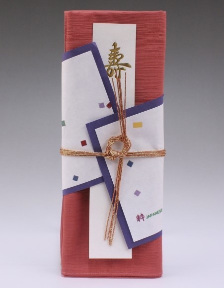 | ■【表包みの特徴】ちぎり絵風の七夕紙に水引を掛けました ■【サイズ】表包み:20.5×8cm、風呂敷:約40cm巾 ■【中身】厚手生地の綿紬風呂敷。従来と素材と質感は全く同じですが、若干濃い目の色合いのため「ローズ」から「レンガ」へと名前が変わりました。 ※一割を入れる袋(寿)も付いています |