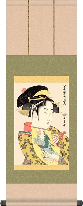 掛軸 (掛け軸) 道成寺 喜多川歌麿 約横25×縦70cm b9317 (洛彩緞子本表装・専用スタンド付) 浮世絵 お土産 事務所 店舗 移転 開店 開業 新築 落成