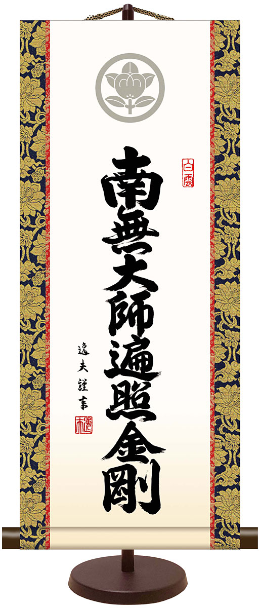 掛軸 (掛け軸) ミニサイズ 家紋入り弘法名号 南無大師遍照金剛 中田逸夫(専用スタンド付)サイズ【80】約横28×縦80cm d6875 法事 法要 供養 仏事 初盆 お盆