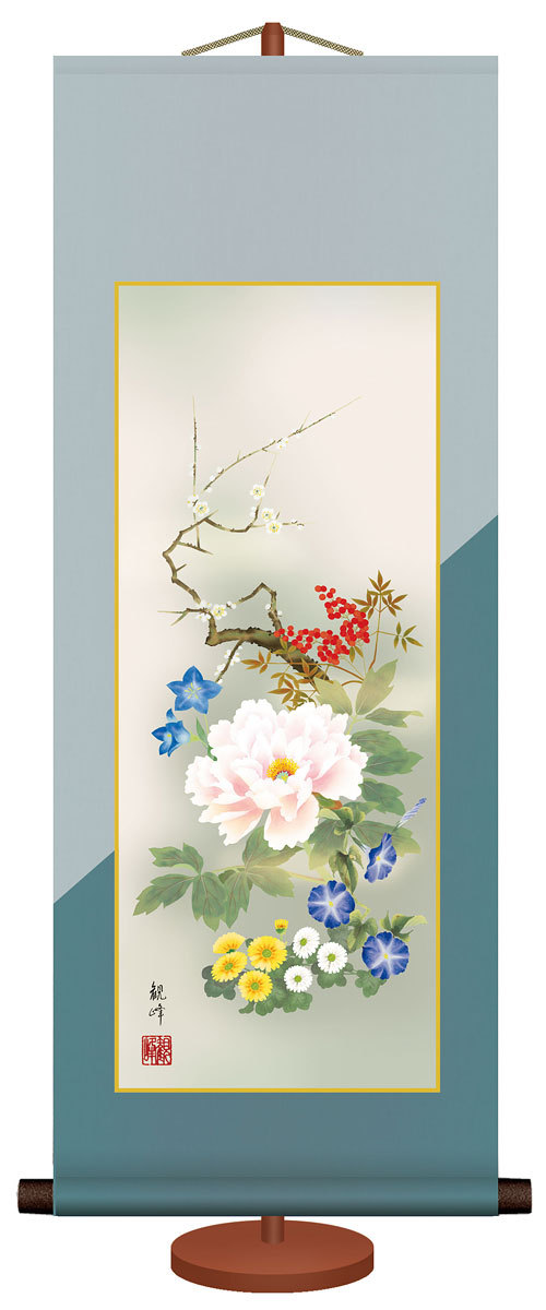 掛軸 (掛け軸) 和風モダン掛 年中掛け 四季花 山村観峰 約横31cm×縦81cm (専用スタンド付) g6430 KM1A10-002 年中掛 年中掛け 花鳥 吉祥 開運