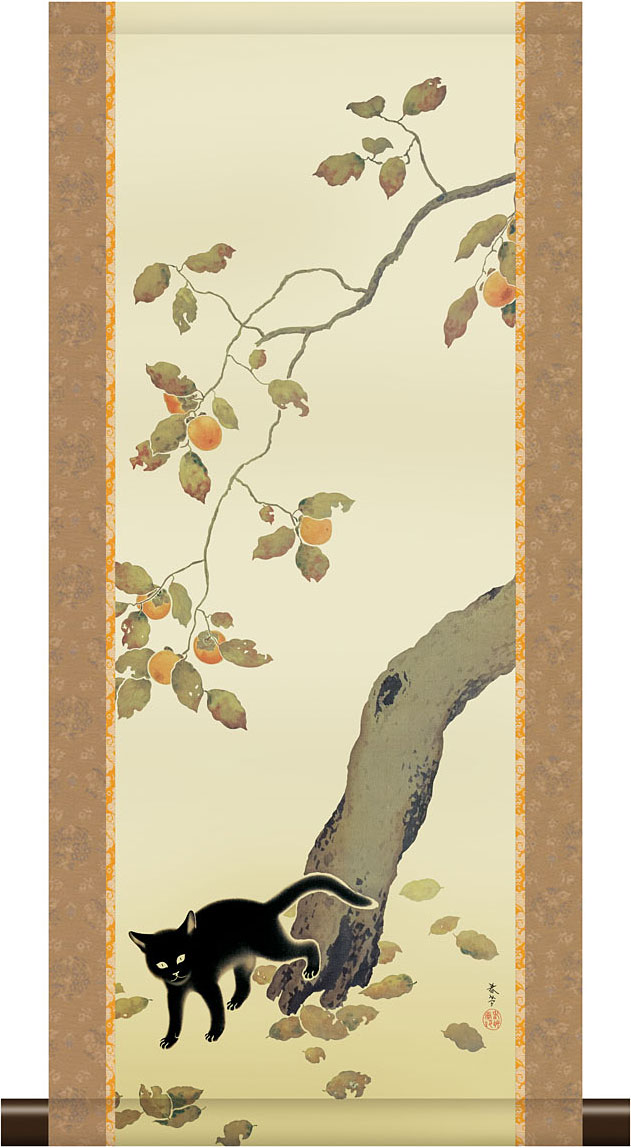 掛軸 掛け軸 和風モダン掛 菱田春草 柿に猫 約横28cm×縦60cm ミニサイズ ミニ掛軸 名画複製画 g6633 KM3R1-076 日本画 巨匠 お祝い 御祝