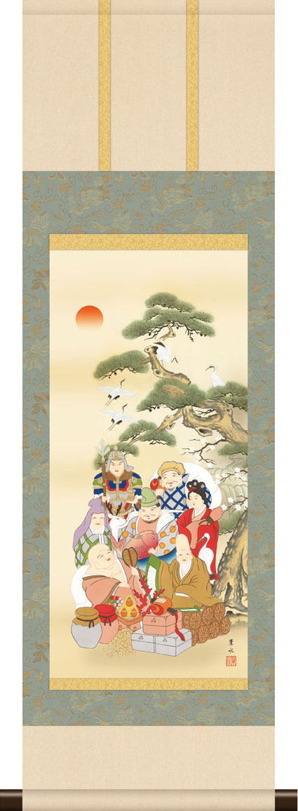 掛軸 掛け軸 本格ミニ掛軸 七福神 緒方葉水 約横28cm×縦90cm ミニサイズ g6779 KM3R2-135 縁起 開運 祝賀 お正月 正月 新年 初夢 長寿 賀寿 開店 開業