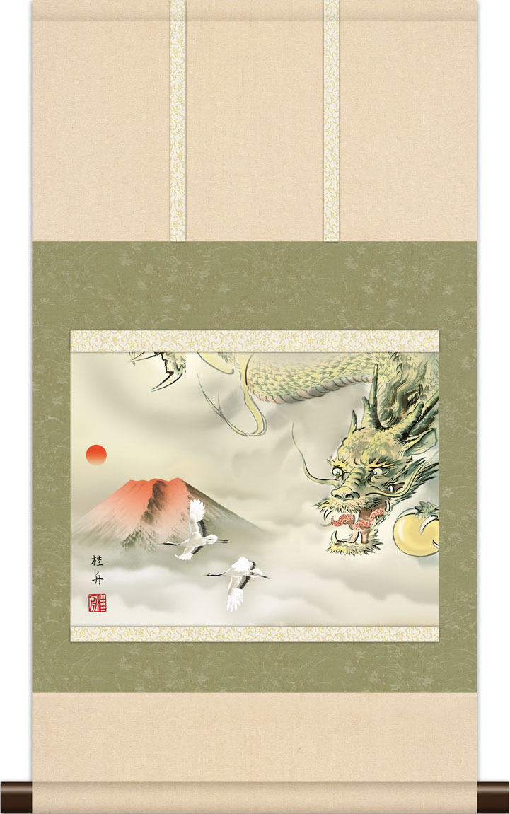 掛軸 干支の掛け軸 本格ミニ掛軸 赤富士龍図 長江桂舟 辰年/龍/竜 約横35cm×縦64cm ミニサイズ g6793 KM3R2-149 縁起 開運 厄除 財運 長寿 賀寿