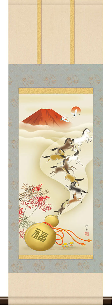 掛軸 干支の掛け軸 本格ミニ掛軸 南天福寿九頭馬 長江桂舟 2026年 午年/馬/うま 約横28cm×縦90cm ミニサイズ g6809 KM3R2-165 縁起 開運 祝賀 お正月