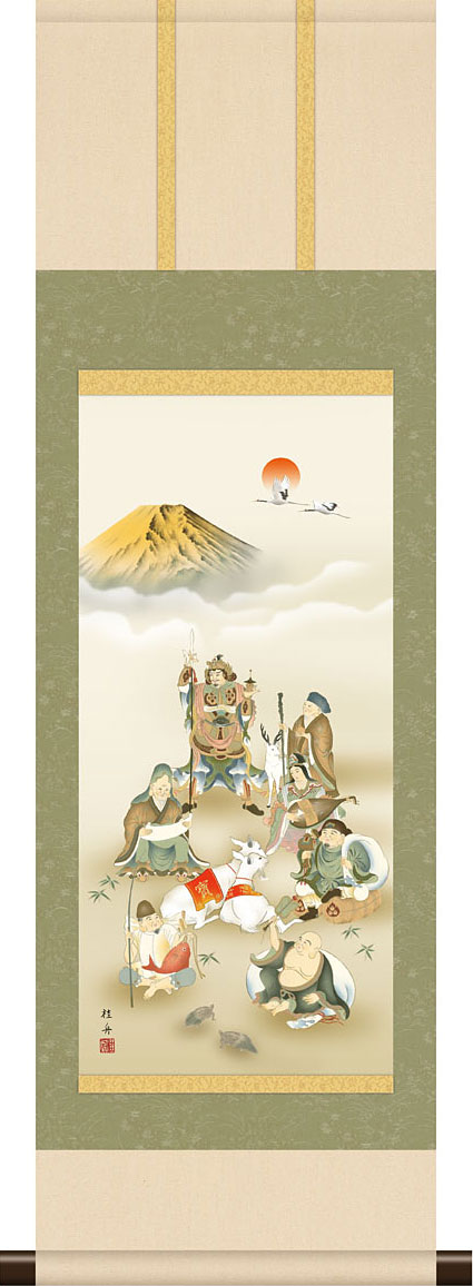 掛軸 干支の掛け軸 本格ミニ掛軸 金峰羊七福神 長江桂舟 2027年 羊年/羊/ひつじ 約横28cm×縦90cm ミニサイズ g6820 KM3R2-176 縁起 開運 祝賀 正月