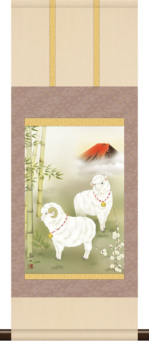 掛軸 干支の掛け軸 本格ミニ掛軸 吉祥赤富士羊図 高見蘭石 2027年 羊年/羊/ひつじ 約横28cm×縦75cm ミニサイズ g6821 KM3R2-177 縁起 開運 祝賀 正月