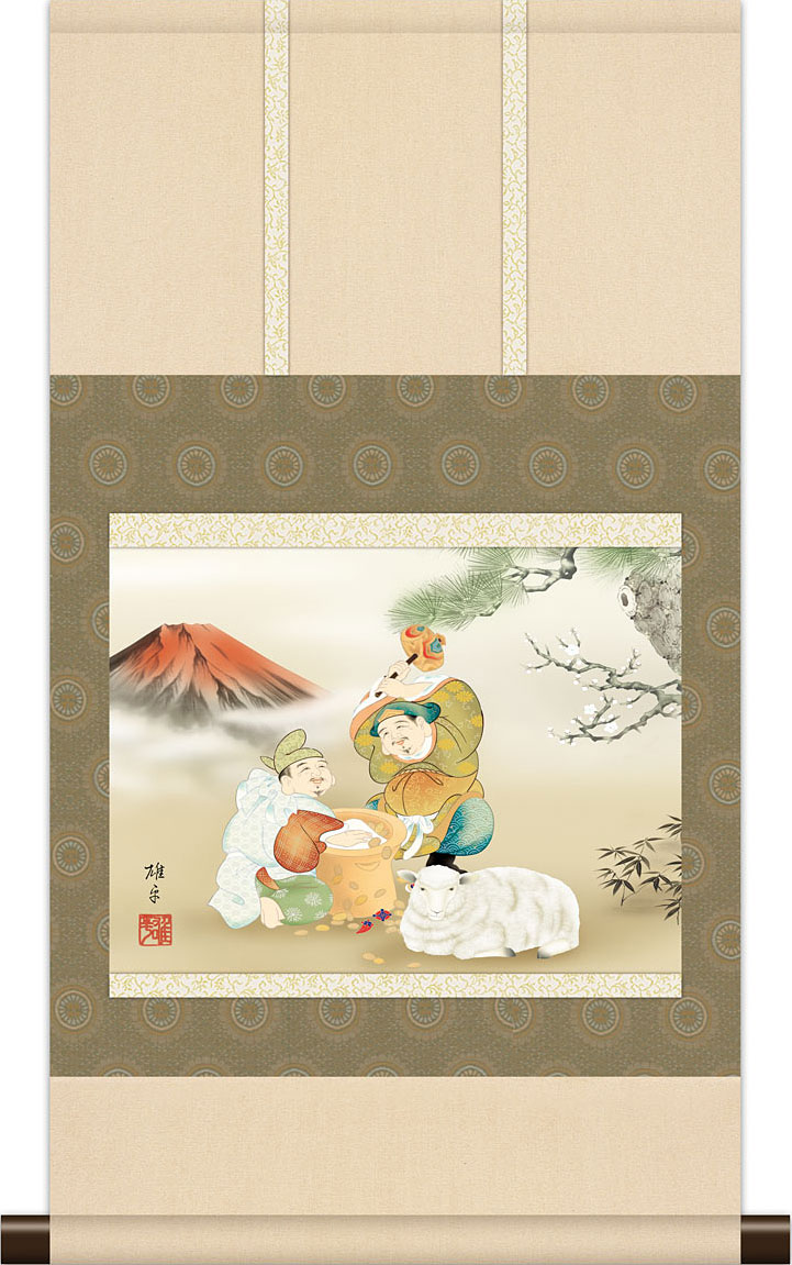 掛軸 干支の掛け軸 本格ミニ掛軸 招福羊恵比寿大黒 鵜飼雄平 2027年 羊年/羊/ひつじ 約横35cm×縦64cm ミニサイズ g6822 KM3R2-178 縁起 開運 祝賀 正月