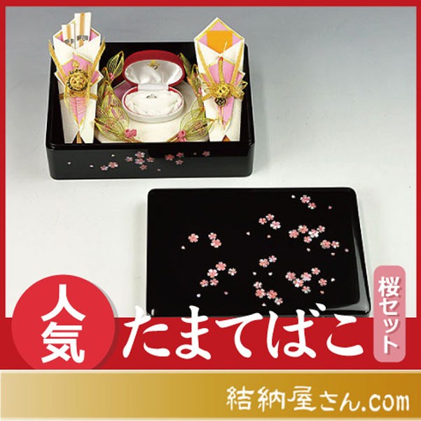 小さいながらも高級感あふれることで人気の「たまてばこ指輪セット」の螺鈿(らでん)細工バージョンです。中底は赤いビロードの布で仕上がっており、文庫箱はもとより、宝石箱としてもご利用いただけます。ふたを盆として使用して目録をセットすることができ、アレンジの幅の広いセットです。コンパクトなので新幹線などで遠方へ結納を持参されるお客様にも最適です。 ※のし・末広とセットにしました。 ※指輪とケースはイメージです。 |
