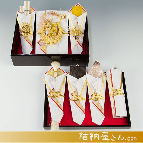 ・結納品3点 (結納金・のし・末広) ・鰹節・スルメ・昆布・友白髪 ・水引飾り(鶴・亀・松竹梅) ・塗箱(天然木 紀州塗) ・結納金を入れる金封(1枚) ・結納飾りの収納箱 ・結納式当日のシナリオ(口上や流れを説明した式次第) ・飾り方・片付け方の説明(写真・イラスト入り) ・白手袋 |