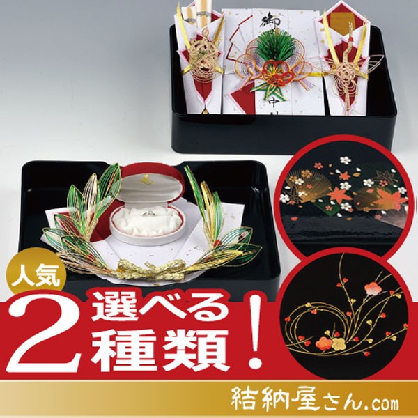 紀州塗り文箱の中に、結納金封、熨斗、末広、指輪飾りをセットしたリーズナブルなセットです。コンパクトなので新幹線などで遠方へ結納を持参されるお客様にも最適です。 |