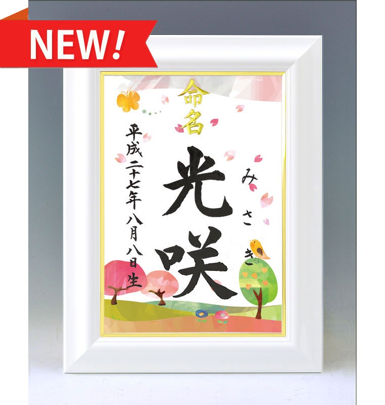 デザイン命名書 A4ホワイト額(四季彩 春 )結納屋さんの毛筆手書き命名書