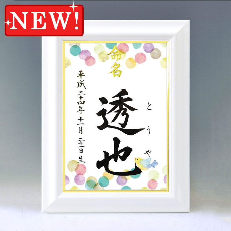一生付き合う大切なお名前をいつまでも大切に飾っておけるよう命名紙とセットで高級感のあるホワイト額をご用意いたしました♪ 命名紙はとても華やかな図柄からお好きなものをお選びいただけます。