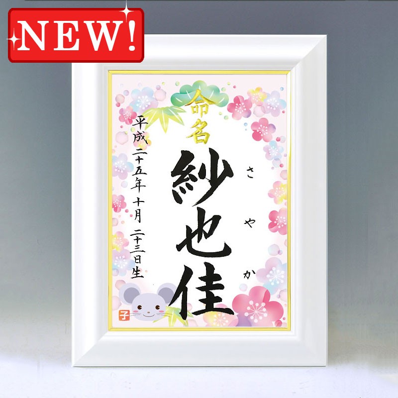 デザイン命名書 A4ホワイト額(干支 子年2 ピンク)結納屋さんの毛筆手書き命名書