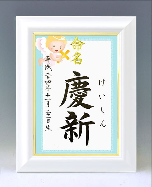 デザイン命名書 A4ホワイト額(天使・ブルー)結納屋さんの毛筆手書き命名書