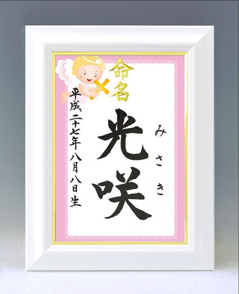デザイン命名書 A4ホワイト額(天使・ピンク)結納屋さんの毛筆手書き命名書