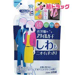 お洋服のスタイルガード しわもニオイもすっきりスプレー つめかえ用(250mL) |商品区分:日用雑貨【お洋服のスタイルガード しわもニオイもすっきりスプレー つめかえ用の商品詳細】<br>●お洗濯やクリーニングが頻繁にできないお洋服の気になるシワを取り除きます。<br>●衣類についた汗やタバコ、焼肉のニオイもすっきり消臭<br>●抗菌・防臭効果で汗のニオイの発生を抑えます。<br>●除菌効果で衣類を清潔に保ちます。<br>●さわやかなデオドラントグリーンの香り。衣類に香りは残りません。<br>●詰め替え用<br>※汚れ落ち効果はありません。【発売元、製造元、輸入元又は販売元】ライオン(株)<br>130-8645 東京都墨田区本所1-3-7 ※問い合わせ番号は商品詳細参照<br>[衣類のお手入れ/ブランド:スタイルガード/]<br>※商品廃番・メーカー欠品など諸事情によりお届けできない場 …続きは商品説明にて