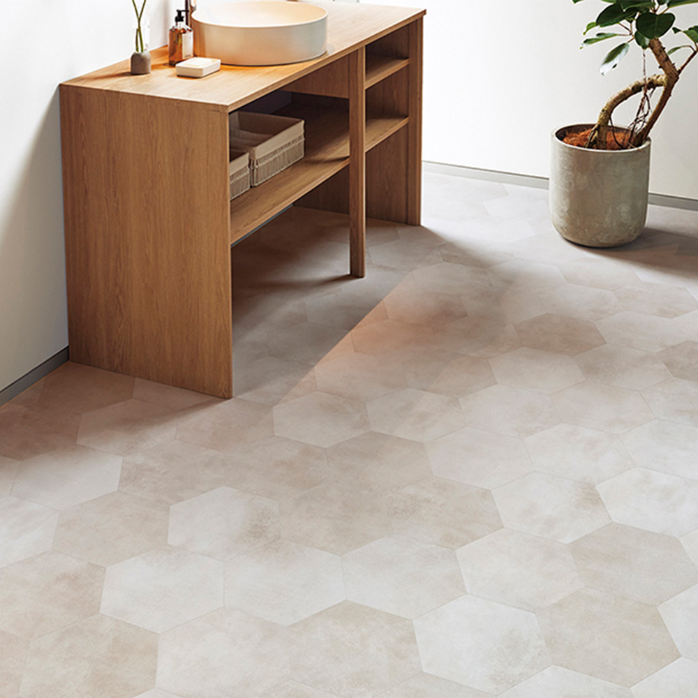 ほどよいムラ感のあるプレーンなヘキサゴンタイルです。ブリードヘキサと組み合わせて施工することで、さまざまなデザイン貼りが可能です。