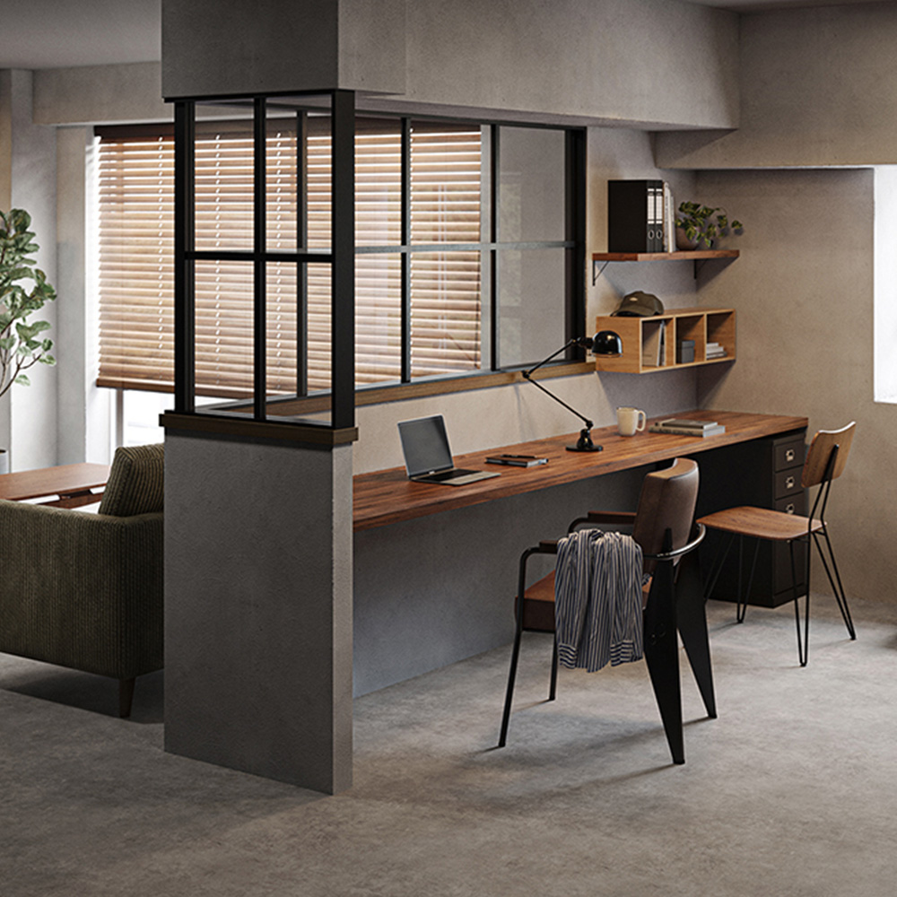 扇状に入ったリアルなコテ跡を表現したモルタル柄です。あたたかみのある色調のため、ナチュラルテイストにもおすすめです。
