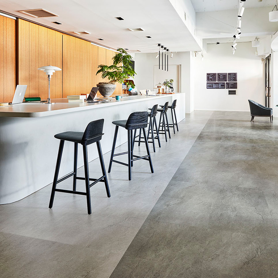 低光沢、ノーワックスメンテナンスの置敷きタイル。抗菌性などの機能性と上質感を両立。