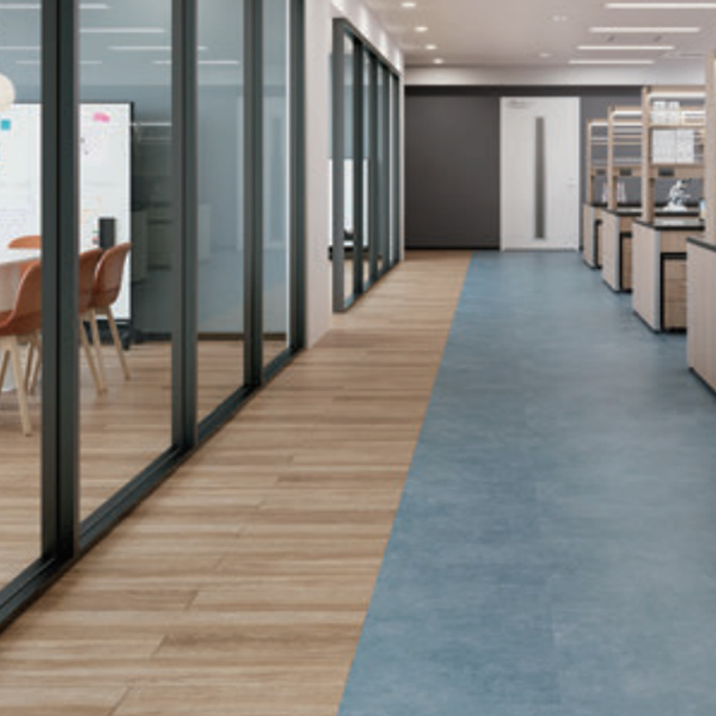 耐薬品性、耐シガレット性、 耐ゴム汚染性を付与した、あらゆる汚染に強い置敷きビニル床タイル。