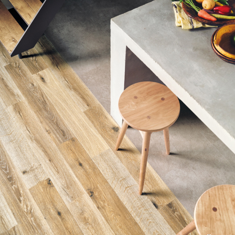 ドライな質感と大胆な面差で、空間に自然なリズムを生むオーク柄です。