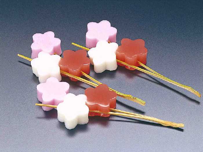 ●三色の梅型ようかんを松葉串に刺しました。