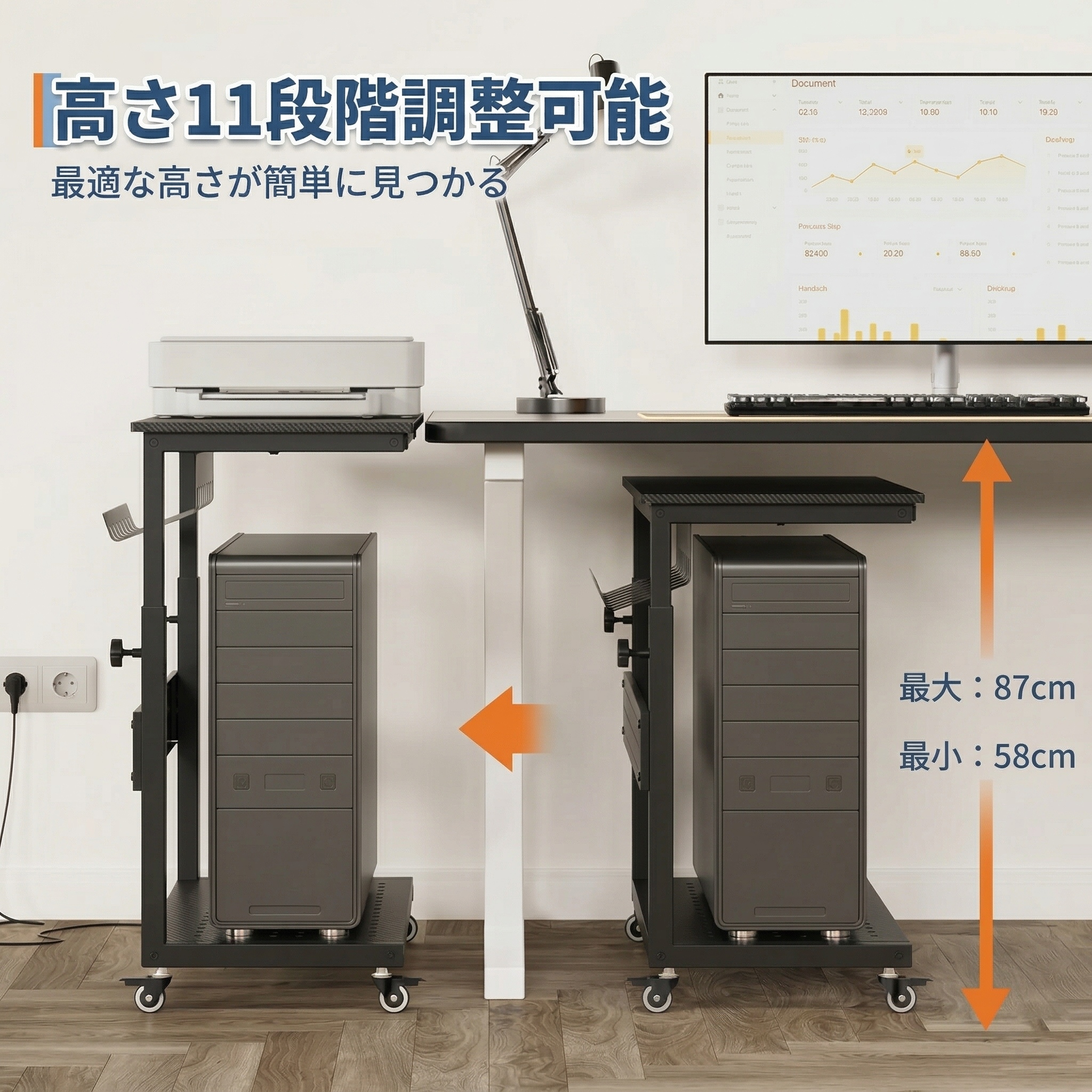【昇降式&耐荷重40kg】天板の高さを58〜87cmの範囲で無段階調整可能。作業内容や体格に合わせて最適な高さに設定でき、長時間の使用でも快適さをキープします。耐荷重40kgで、デスクトップPCや周辺機器も安心して載せられます。