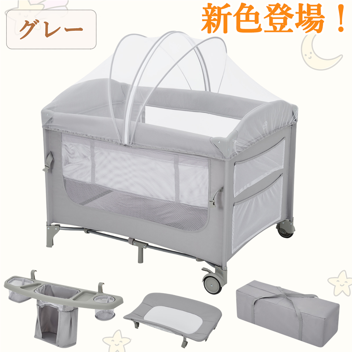 | 製品特徴 | 新生児から成長に合わせて長く使える多機能プレイヤードです。 【蚊帳付き】:蚊帳付きで、虫や蚊よけの対策になり、赤ちゃんはぐっすり眠れます。 【取り外し可能おむつ交換台】:1日何回もおむつ替えしなければいけないので、おむつ替え時の姿勢がラクで、出産直後のママの体に優しいです。 【収納ポケット】:本体サイドに掛けて設置でき、毎日使う哺乳瓶、タオル、オムツなどのベビー用品を手の届く位置に収納できます。 【プレイヤードにも変身可能】:床板を一段目に調整し、乳幼児期の遊び場プレイヤードに変形し、成長に合わせて長く使えるタイプです。 【折り畳め式】:コンパクトに折りたたみ可能で、旅行先や帰省先などへの持ち運びにも便利です。 【キャスター付き】:キャスターを備えたタイプで、移動しやすく、お掃除も楽々です。 【たっぷりな収納スペース】:新生児時、下の部分は便利な収納スペースとして、オムツや掛布団などケア用品を収納できます。 本体サイドにある収納袋はおむつやウェットティッシュの収納に便利です。 【自分のライフスタイルにマッチする多機能なプレイヤード】 |